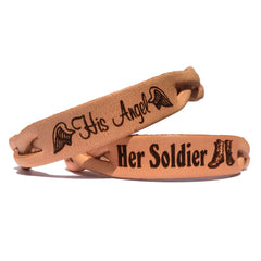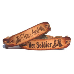 His Angel & Her Soldier Bracelets are a military couples sweet sentiment. Show your pride with these! Get them in stained or natural leather.