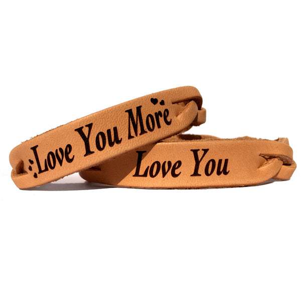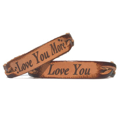 The "Love you & Love You More" bracelets are for those couples that know the best feeling in the world is being loved back by the person you love! One bracelet has small hearts adorning it and the other bracelet has just the words "I Love You". You choose the color! It comes in a rich brown stain or totally naked (natural leather). This is a set and you will get both when adding it to the cart. All of our leather products are made to order by hand in our shop.