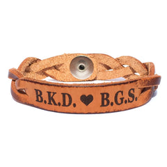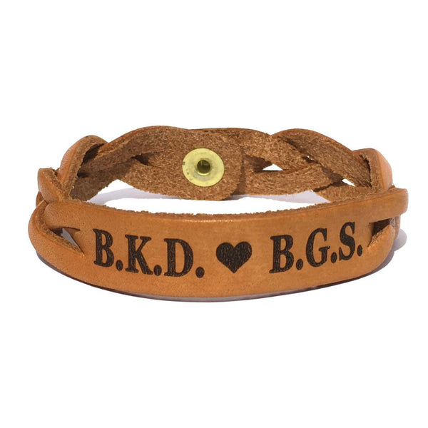 This bracelet has both of your initials engraved with a heart in the middle. Available in natural leather or with a rich dark stain on the braiding.
