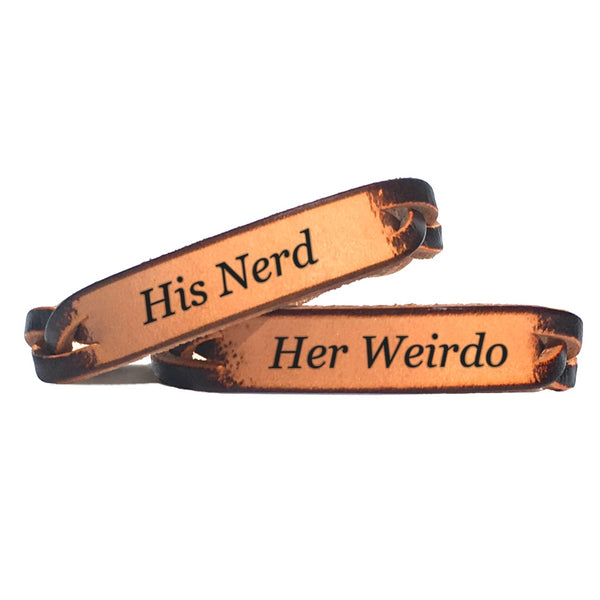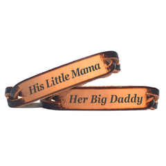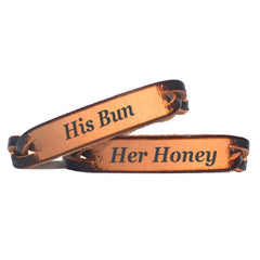 Get your names, nicknames (or anything else you want) engraved on these His & Her Leather Braided Bracelets. Your choice of stained or natural leather. Available in three different sizes. Sold as a set.