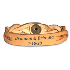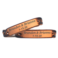 Celebrate your love with this personalized leather bracelet. Choose from beautiful rich brown stain or all natural leather. Sold Individually.