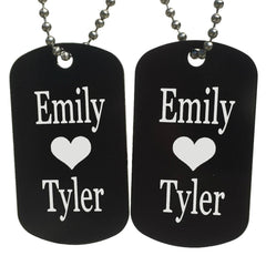 "Heart with Names" Dog Tag Necklaces. A couples set. Surprise your love! You get both designs for one price. Personalize with your names at no extra charge. Only add One to the cart because you get both.