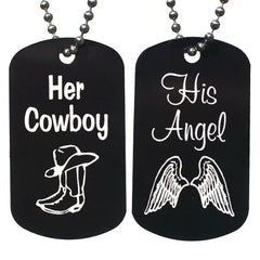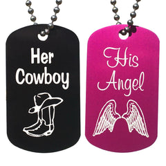 Her Cowboy and His Angel Dog Tag Necklaces are the perfect gift to show them how you feel! This is a Couples set so you get both tags! Super fast shipping from an American Company located in the panhandle of Florida!