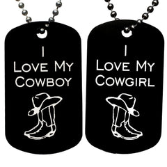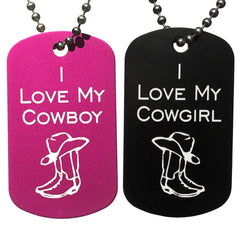 "I Love My Cowgirl & I Love My Cowboy" Dog Tag Necklaces are a couples set. Surprise your love! You get both tags for one price!
