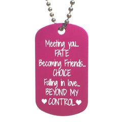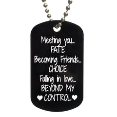 "Meeting you, Fate, Becoming Friends, Choice, Falling in Love, Beyond My Control" Dog Tag is such a sweet way to let that special someone know your love is meant to be. This tag is sold individually and only one will be added to the cart.