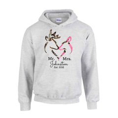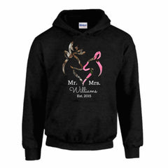 This adorable Hoodie celebrates the day you established your love in a forever commitment. Designed in a brown camo on the buck and a pink camo on the doe with Mr and Mrs "Your Name" and Date. Perfect gift for birthdays, anniversary or just because you love it!