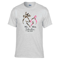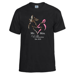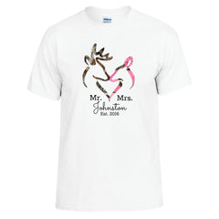 This adorable T-shirt celebrates the day you established your love in a forever commitment. Designed in a brown camo on the buck and a pink camo on the doe with Mr and Mrs your Name and Date. Perfect Gift for birthdays, anniversary or just because you love it!
