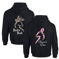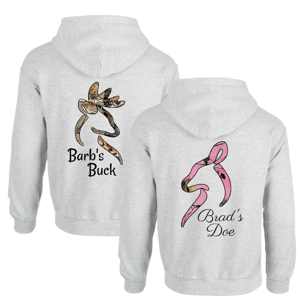 The Country Classic Buck and Doe design gets Personalized with your names! Available in Gray and Black! Pocket front with drawstring in the hood. Comfortable and Soft.
