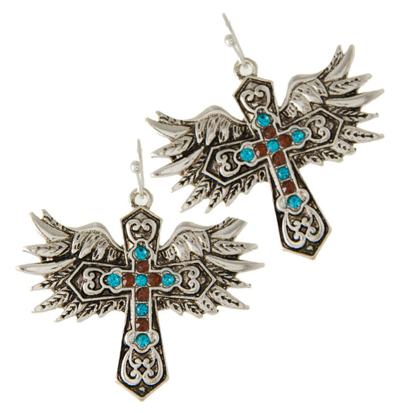 The "Free bird Aqua Earrings" are a beautiful cross with wing design. The rhinestones are brilliant aqua and rich ruby red. This design is also available with crystal rhinestones. The length is about 1.5". It has a fish hook backing.