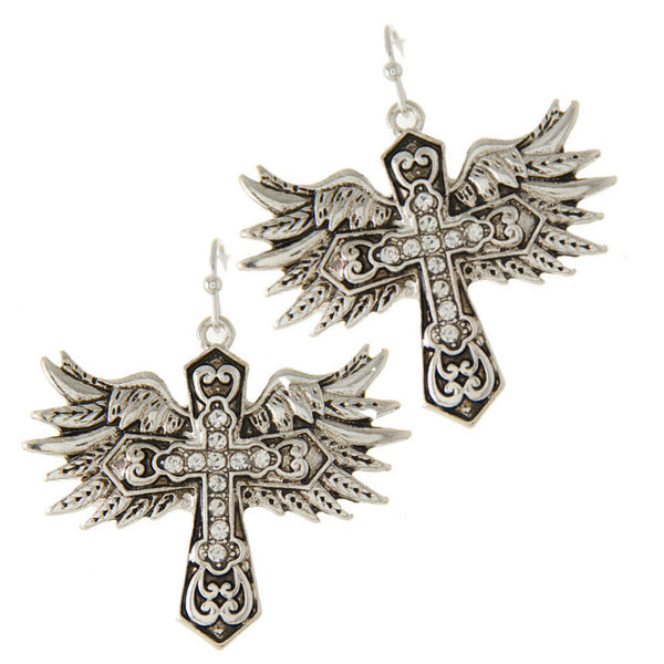 The "Free Bird Earrings" are a beautiful cross with wing design with crystal rhinestones. This design is also available withbrilliant aqua and rich ruby red rhinestones. The length is about 1.5". It has a fish hook backing.