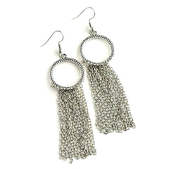 The Tassel Earrings have rhinestones adorning the textured hoop, the tassels hang from the bottom. Available in silver and gold colors. They Hang about 3 inches in length and have a fish hook backing.
