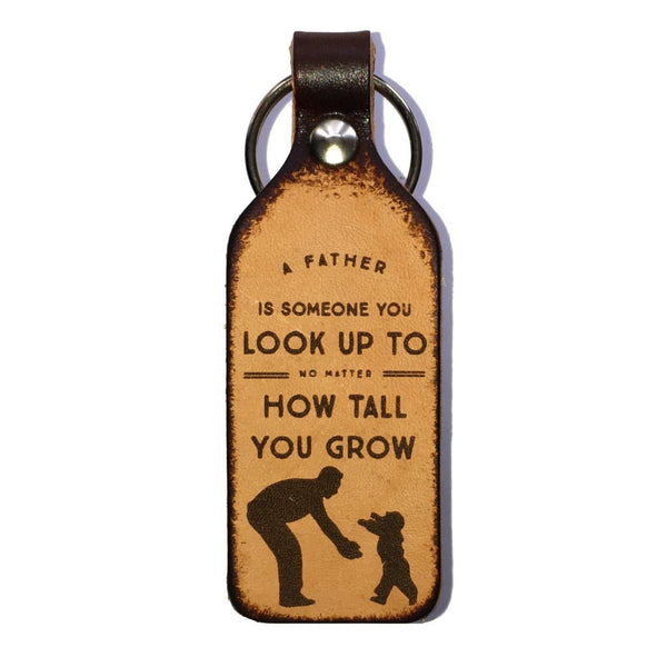A Father is someone you look up to no matter how tall you grow! This gorgeous leather engraved keychain is made in our shop and features a child running into Dad's arms. It truly is the sweetest sentiment. Stained a beautiful brown. Perfect for his birthday or Father's Day! Back can be engraved with your special message or dates!