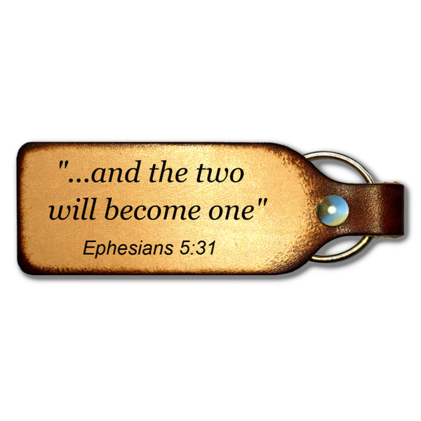 This beautiful sentiment taken from Ephesians 5:31 is laser engraved into this durable leather keychain.