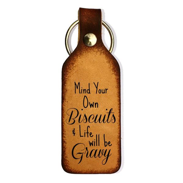 Mind Your Own Biscuits and Life will be Gravy! This keychain is an awesome but subtle way to let them busy bodies know to mind their own business. Great gift for the hard to buy for and so DANG FUNNY! Stained a dark brown