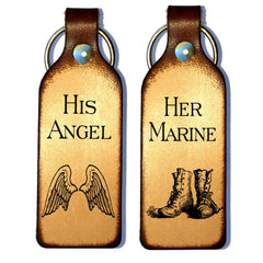 Her Marine & His Angel Leather Keychains are a sweet gift for celebrating your love. They are stained beautifully and made to order. Perfect present for newlyweds, engaged couples, celebrating a special day or just because!