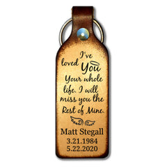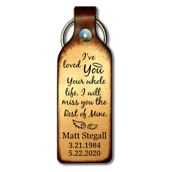 "I've loved you your whole life. I will miss you the rest of mine." This memorial keychain is 1.5" wide and 4" tall. Made with real leather and all its unique texture and imperfections. Stained a beautiful dark brown and engraved with your loved ones name and dates. A great way to keep your loved one close. A unique keepsake to let someone you love know how much you care about their loss.