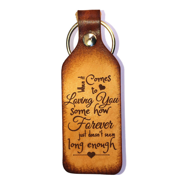 When it comes to loving you, somehow forever just doesn't seem long enough is a beautiful sentiment to commemorate your love!  A great gift for your boyfriend, girlfriend, husband, wife or child. This keychain is stained a beautiful brown. Handmade in our shop and ships fast!