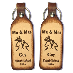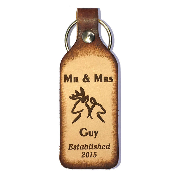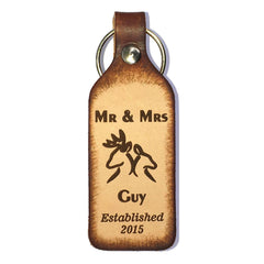 "Mr & Mrs" Buck and Doe Leather Keychain is a great gift for newly engaged, soon to be bride and grooms, Anniversary or any couple celebrating a milestone! This keychain is made to order with name and date engraved at no extra charge. Beautifully stained for a lasting impression. This keychain is sold individually.