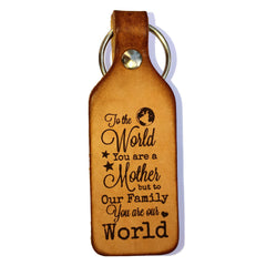 To the World you are a Mother but to our Family, You are the World leather Keychain says it all on how important Mom is to the family. Great gift for Mother's Day, Birthdays or just because! Back Can be engraved with your special message. The keychain is handmade in our shop. It is stained a beautiful brown.