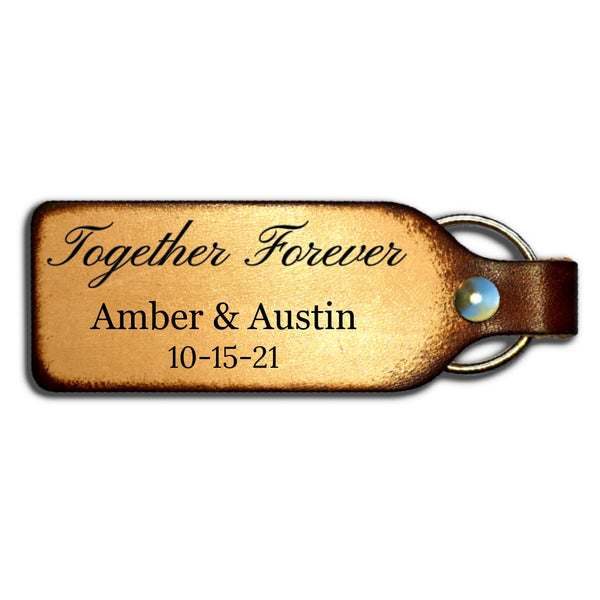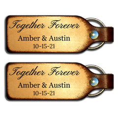 This couple's keychain makes a great gift. Made with durable cowhide leather, hand-tooled, and laser engraved with your names and special date.