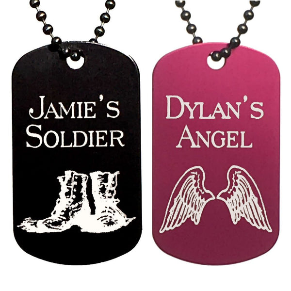 Angel & Soldier with Your Names Dog Tag Necklaces come with personalization at no extra charge. This is a couples set so you get both tags when adding it to the cart! Super fast shipping from an American Company located in the panhandle of Florida!