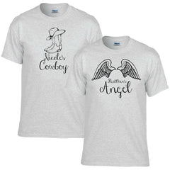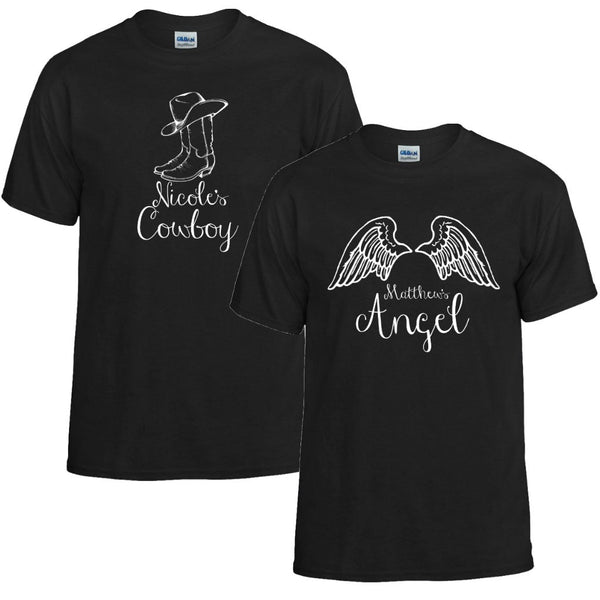 This fun design comes with your names personalized as Her Cowboy and His Angel. Don't see the colors you want? Request your favorite! There is a good chance we can do it!
