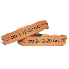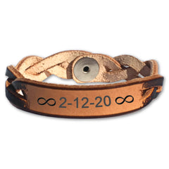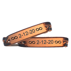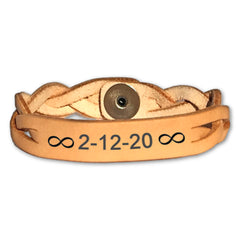 This personalized leather bracelet features your special date bracketed with two infinity signs. Choose from beautiful rich brown stain or all natural leather.