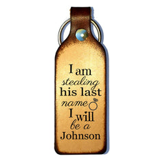 Surprise her when popping the question! She will want to show off her engagement with this keychain. This beautiful keepsake leather keychain is made to order, comes with free personalization and is beautifully stained for a lasting impression. Back can be engraved with your special message. Find the matching tee to really put a smile on her face! This item can be customized.