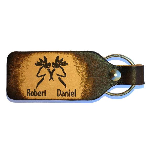 Two Bucks Leather Keychain is handmade at the time of the order and customized with your names at no extra charge. Stained a gorgeous dark brown. This makes for a very unique gift for that couple celebrating their love!