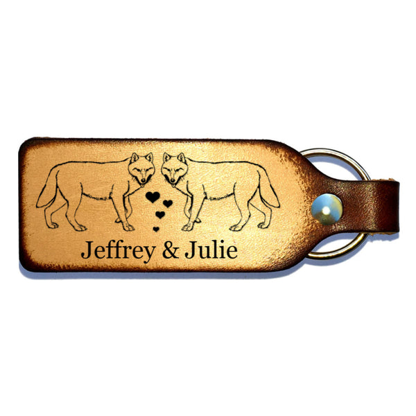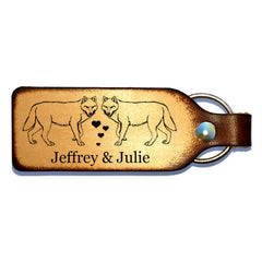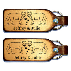 This cute couple's keychain features a pair of wolves, hearts and free name engraving.