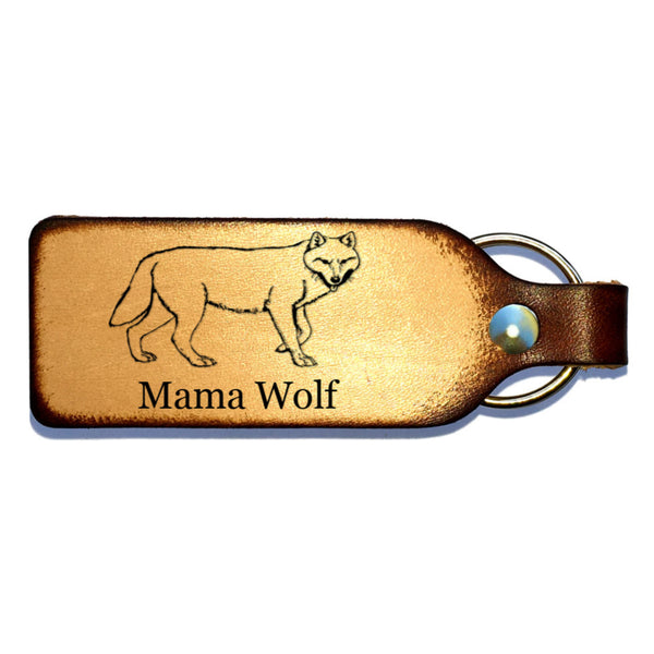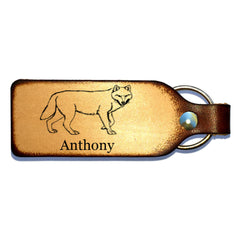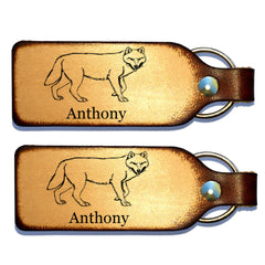 The engraved leather keychain features a lone wolf and the name or names of your choice.
