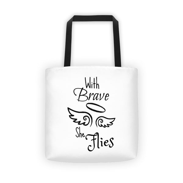 "With Brave Wings She Flies" is for any girl starting a new journey. Show your support with this unique tote.