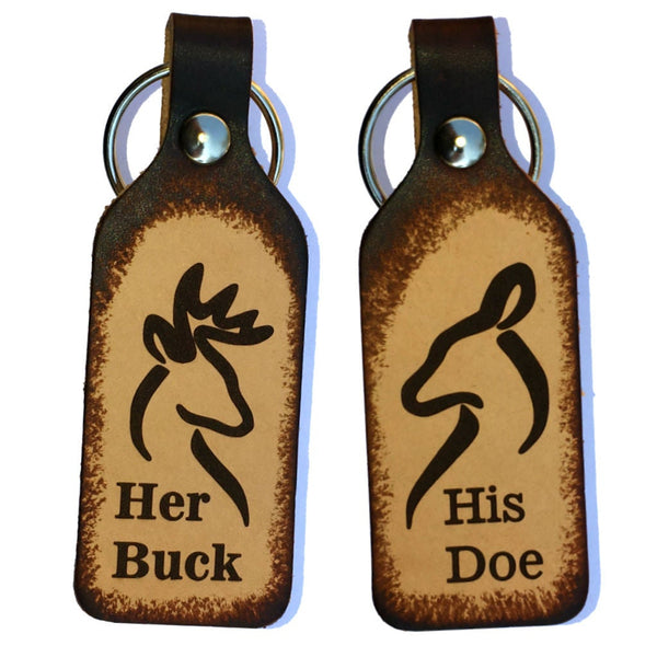 Her Buck & His Doe Couples Leather Keychains is a sweet gift for celebrating your love. The design shows the outline of a Buck on one with the Doe on the other. They are stained beautifully and made to order. Perfect present for newly weds or engaged couples. You get both at checkout when entering the quantity of one.