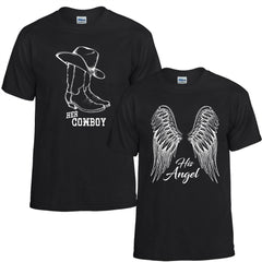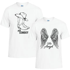 Her Cowboy and His Angel in this classic design for couples. Sold as a set. Made to order. Special Order Navy or Gray and Sizes from Small through 5XL.