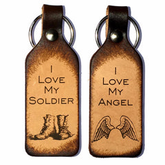 "I Love My Angel & I Love My Soldier" Leather Keychains is a couples set. You get both keychains! Made to order with a dark luxurious stain. When adding to cart only add (Quantity of) One, You will get both! You are going to love these!