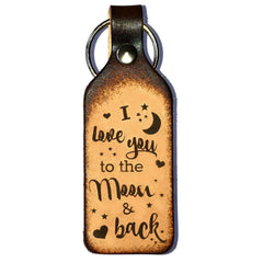 I Love You to the Moon & Back Leather Keychain is a perfect gift for anyone that you love bigger than life. This keychain is made to order and is beautifully colored with a dark brown stain.