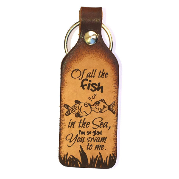Of All the Fish in the Sea, I'm so Glad You Swam to Me Leather Keychain is a whimsical and cute way to let your other half know how grateful you are they chose you! Great gift for new relationships or committed couples!  This Keychain is stained a beautiful brown and can be engraved on the back with a special message or your names.
